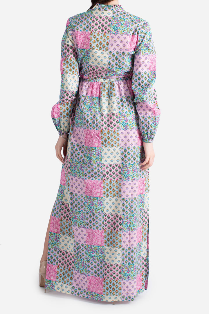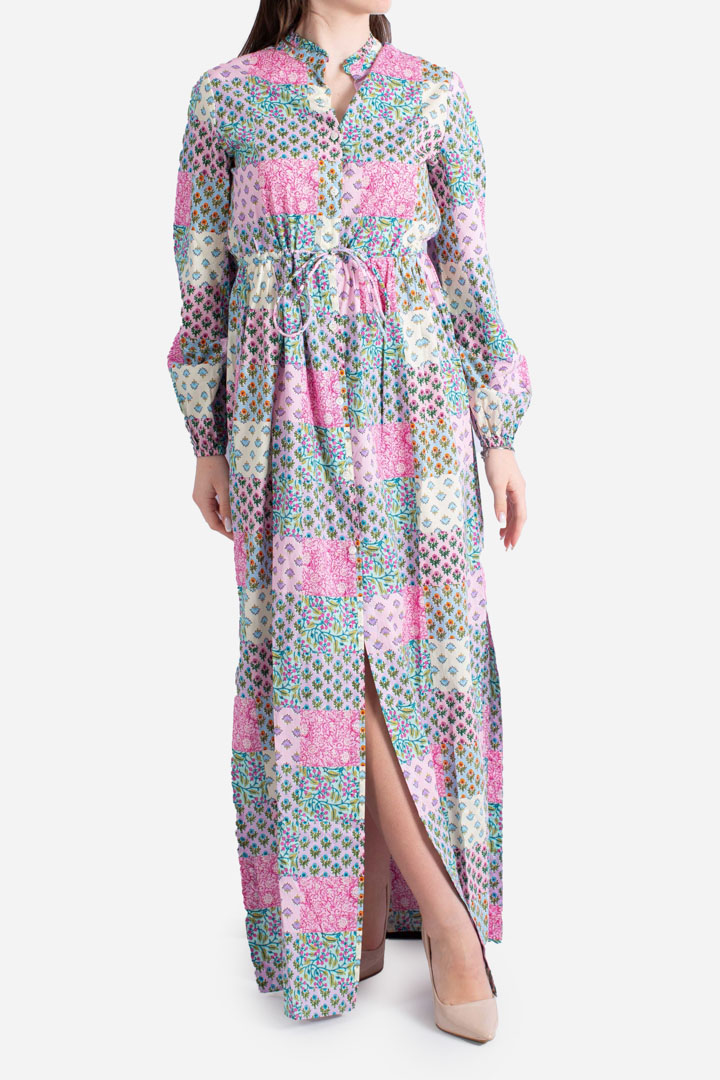 Damska sukienka plażowa z wielokolorowym nadrugiem. Krój regularny z długim rękawem i w tali ze sznurkiem.