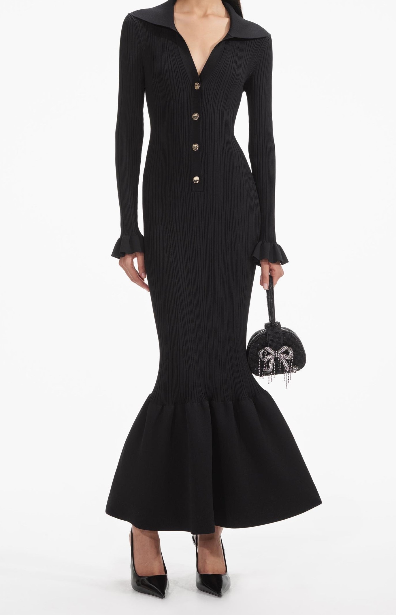 Sukienka SELF-PORTRAIT BLACK RIBBED KNIT FLUTED MIDI DRESS