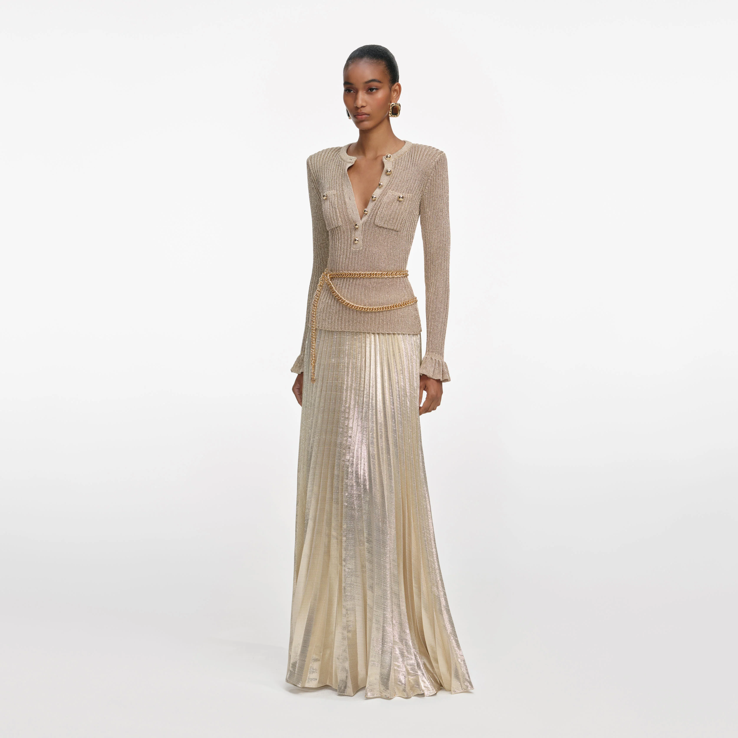 Teksturowe połączenie tworzy szykowny kontrast w tej długiej sukience, która składa się z lureksowej dzianinowej góry i rozkloszowanej spódnicy, która spływa niczym płynne złoto.