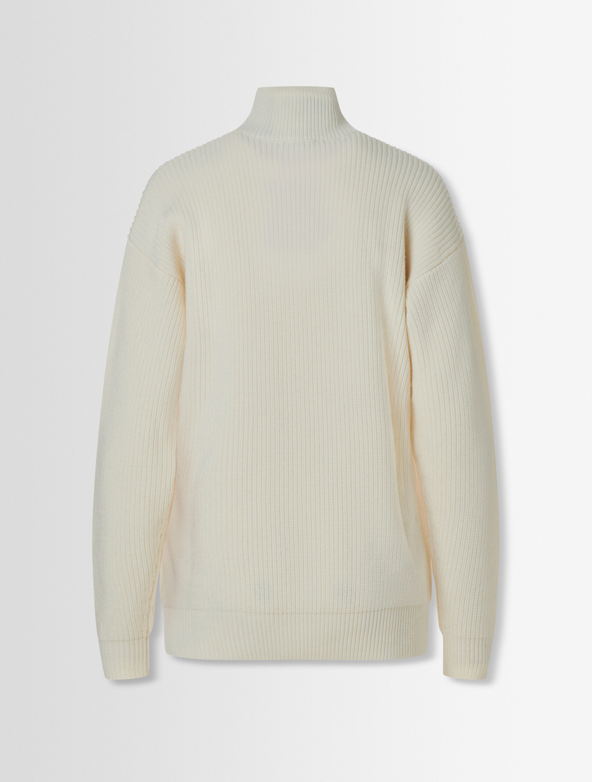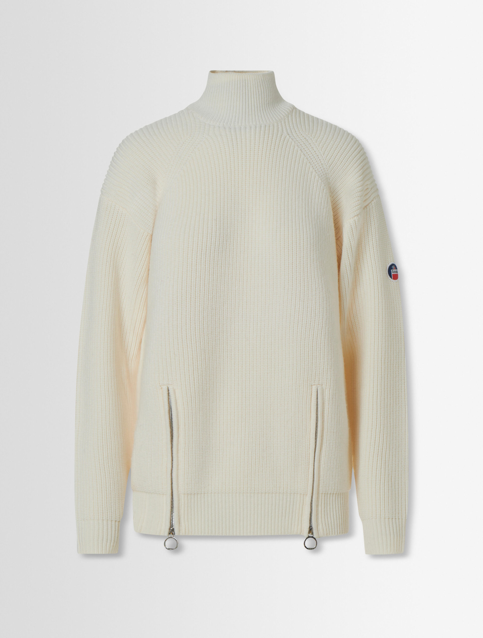 Sweter CYBELE jest wykonany z wełny Merino, która zapewnia ciepło. Ma luźny krój, dwa błyszczące zamki na dole, ściągaczowe wykończenie przy mankietach i u dołu. Można połączyć go ze spodniami lub dżinsami, aby uzyskać elegancki, a jednocześnie swobodny strój.